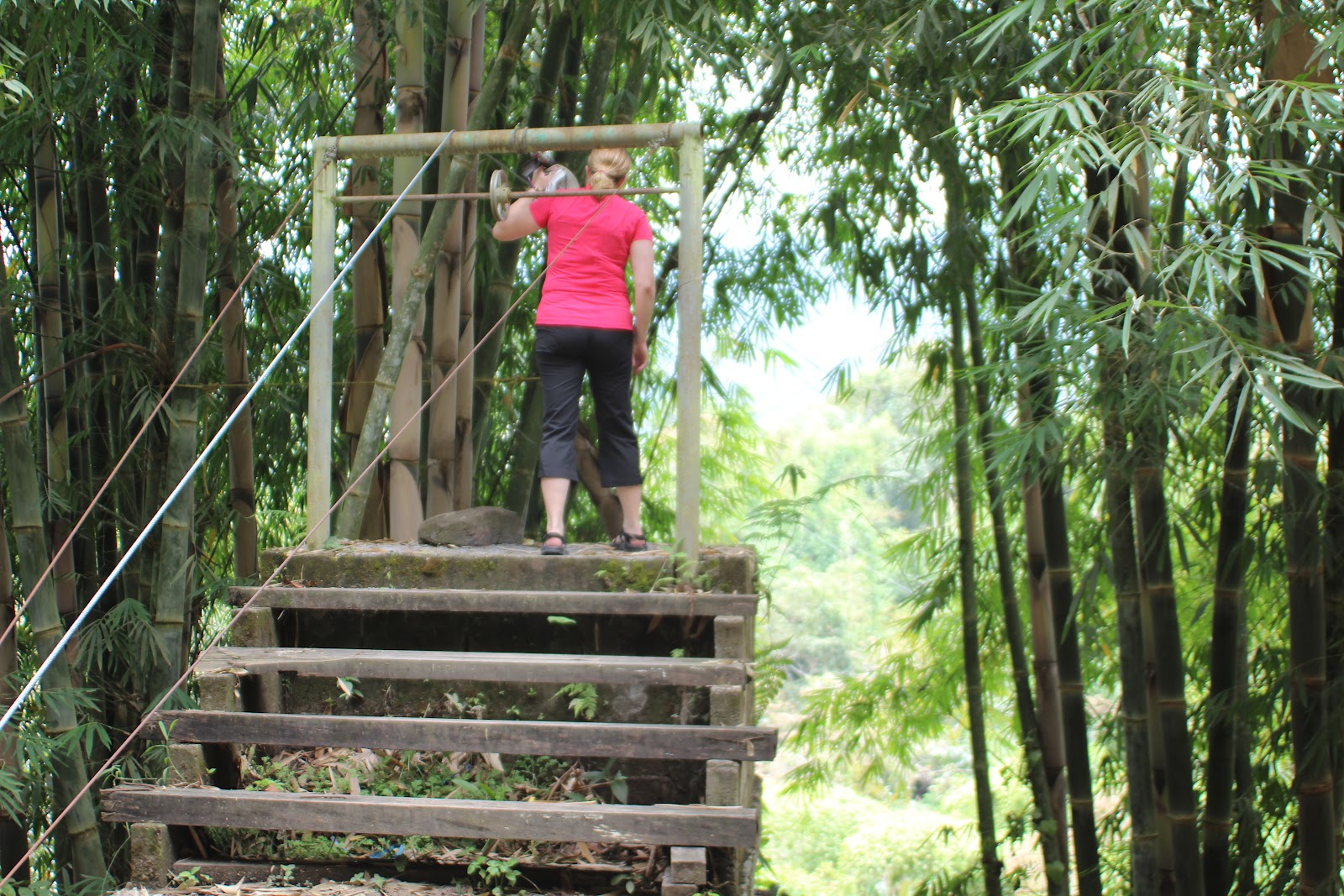 When we arrived at the "Taribita" (cable car) we paid our $5 and got into the little 4 person basket. One of the workers stood on a ledge off the cart, hanging on without security. The other worker fired up the gas engine, stepped on the gas and off we went, zooming across this valley at 150 feet or so above the trees. It is a 530 meter (1,740 feet) cable and you get whisked across in a brisk minute or so.